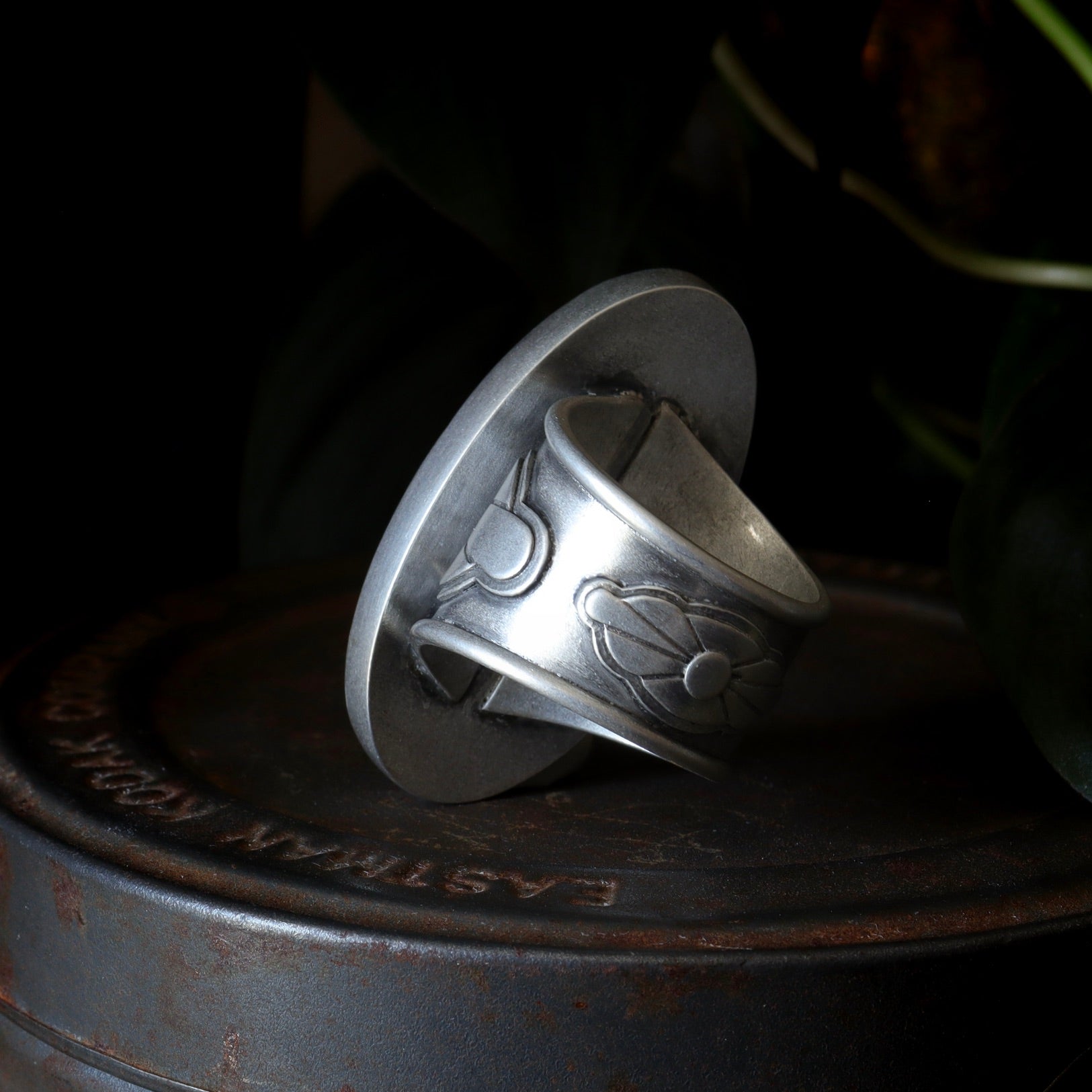 Brecciated Blue Mountain Jasper set in Argentium silver. Stone is 1 5/8" tall and set on a decorative wide band. Ring is a size 10, but fits like a 9.5.