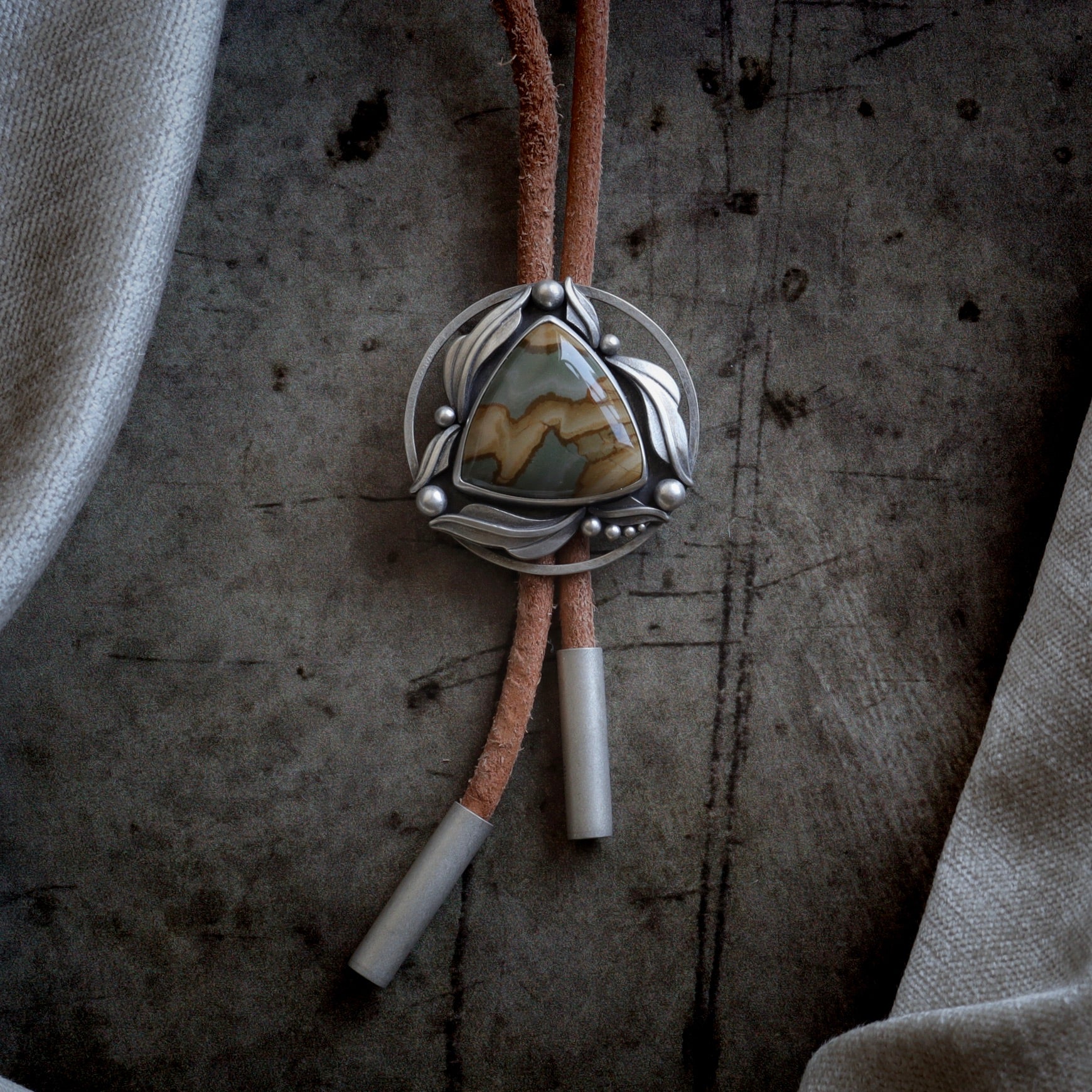 Deer Sky Jasper set in Argentium silver with leaf detailing. Bolo is 1.5" tall on a 36" leather cord.