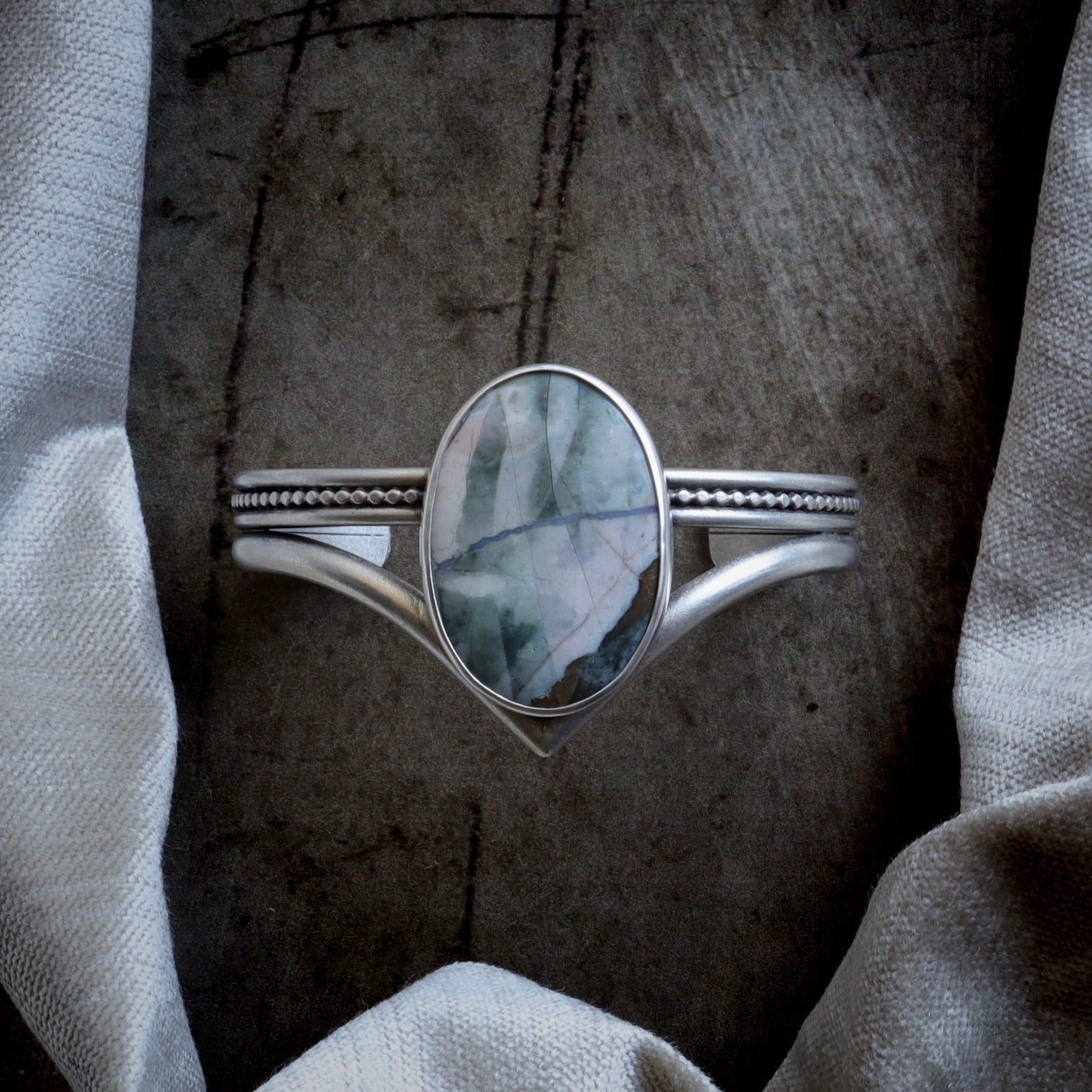 Juniper Jasper set in Argentium silver. Cuff is 1.5" tall and the circumference is 5" with a 1 1/4" opening. Fits best on a 6.5" wrist.