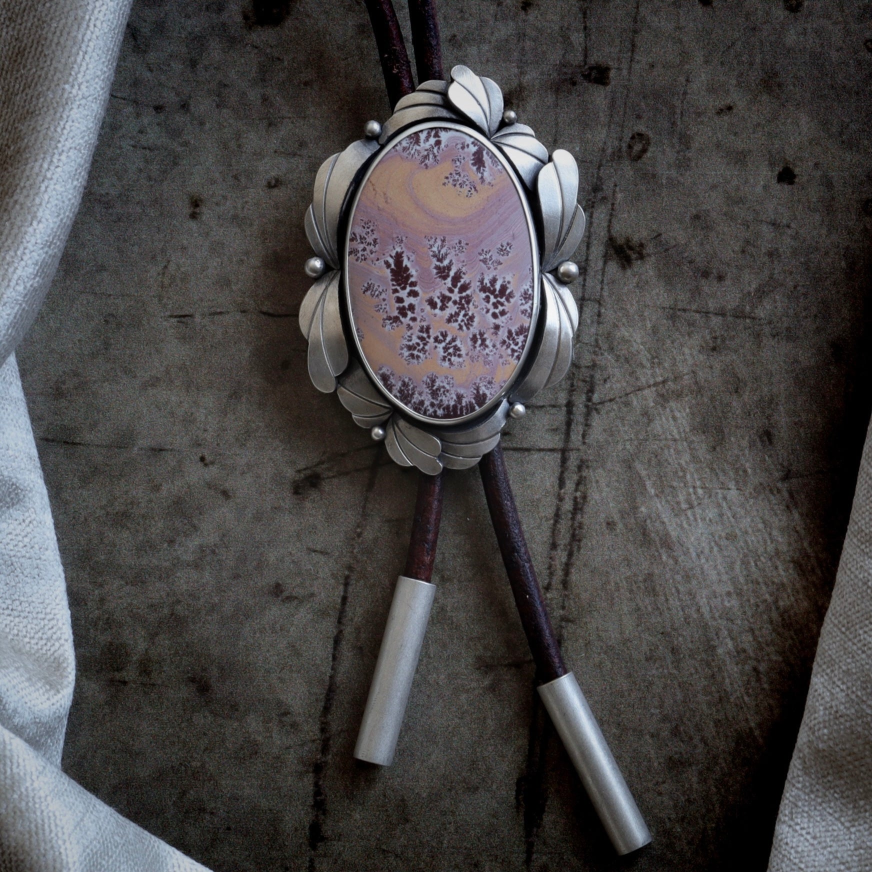Sonoran Dendritic Rhyolite set in Argentium silver with leaf detailing. Bolo is 2.25" tall and 1.5" wide on a 36" leather cord.