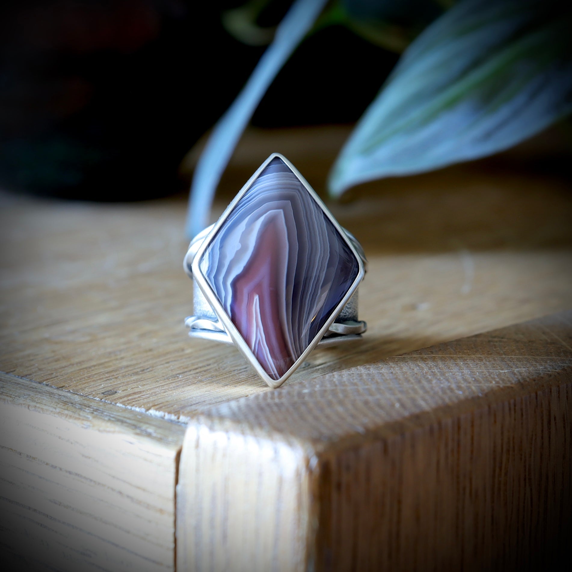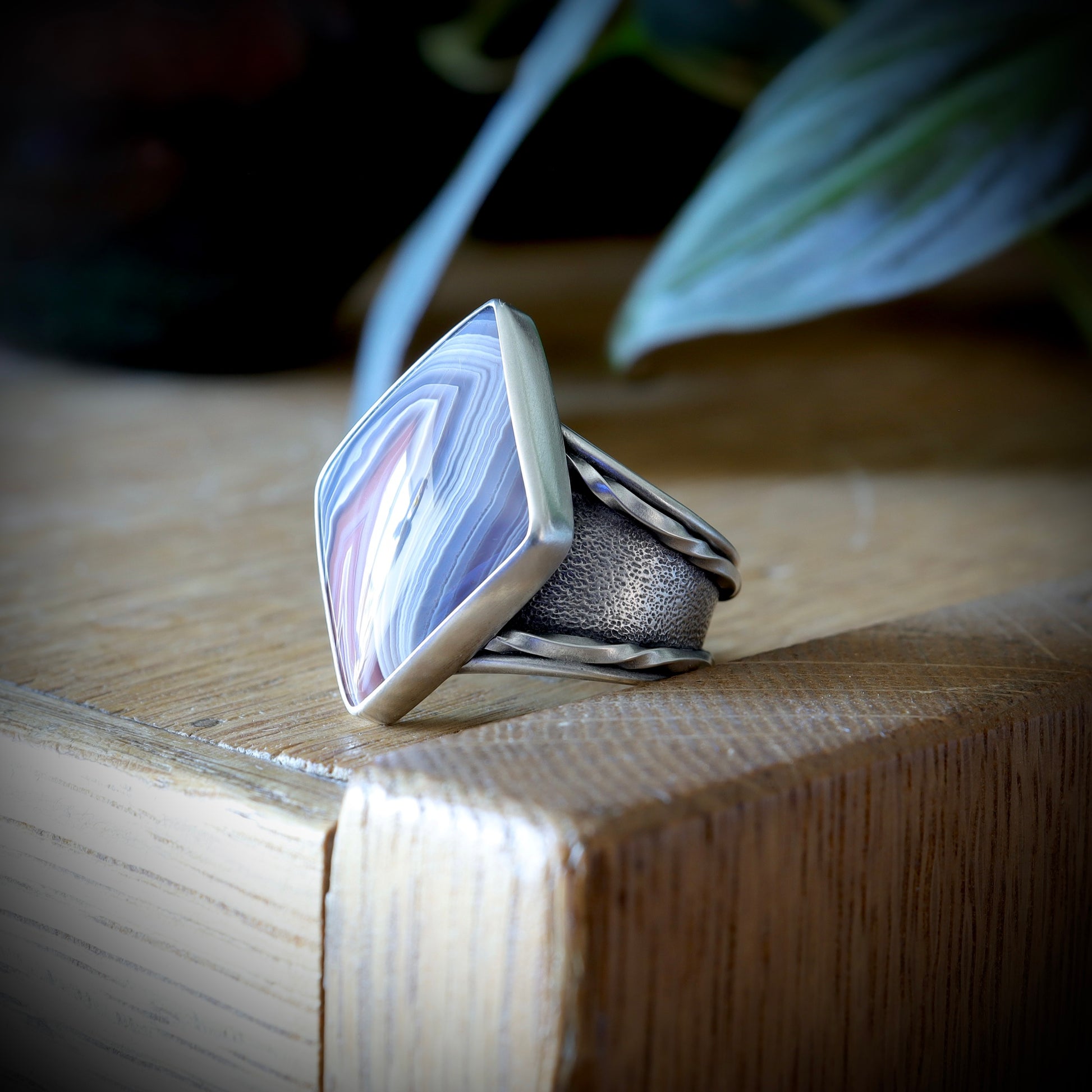 Swazi Agate set in Argentium silver with a decorative wide band. Ring is 1 1/8" tall and a size 9.