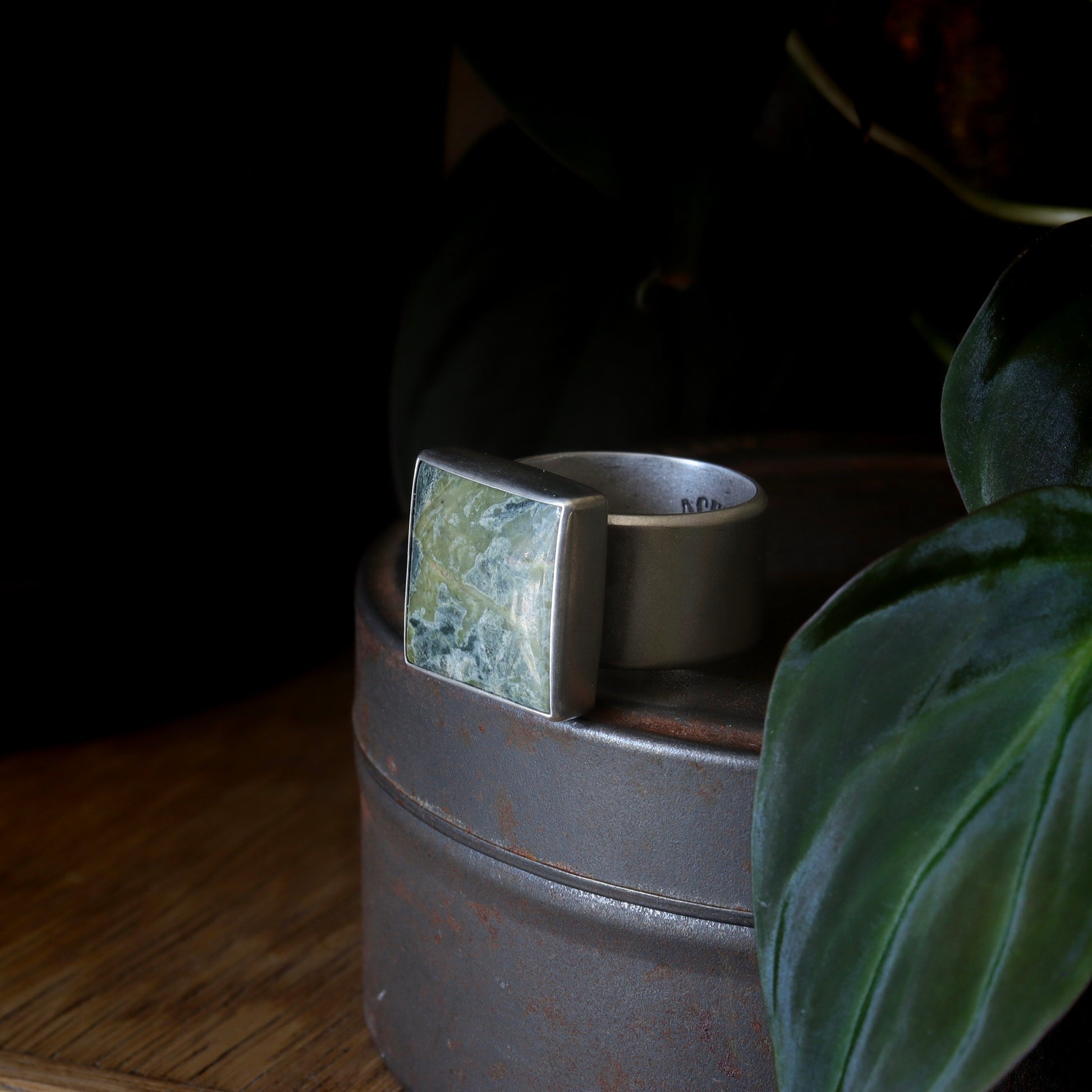 Self collected Truckee River Jasper set on a heavy gauge, wide band made from Argentium silver. Ring is 3/4" tall and a size 11.5, but fits like an 11.